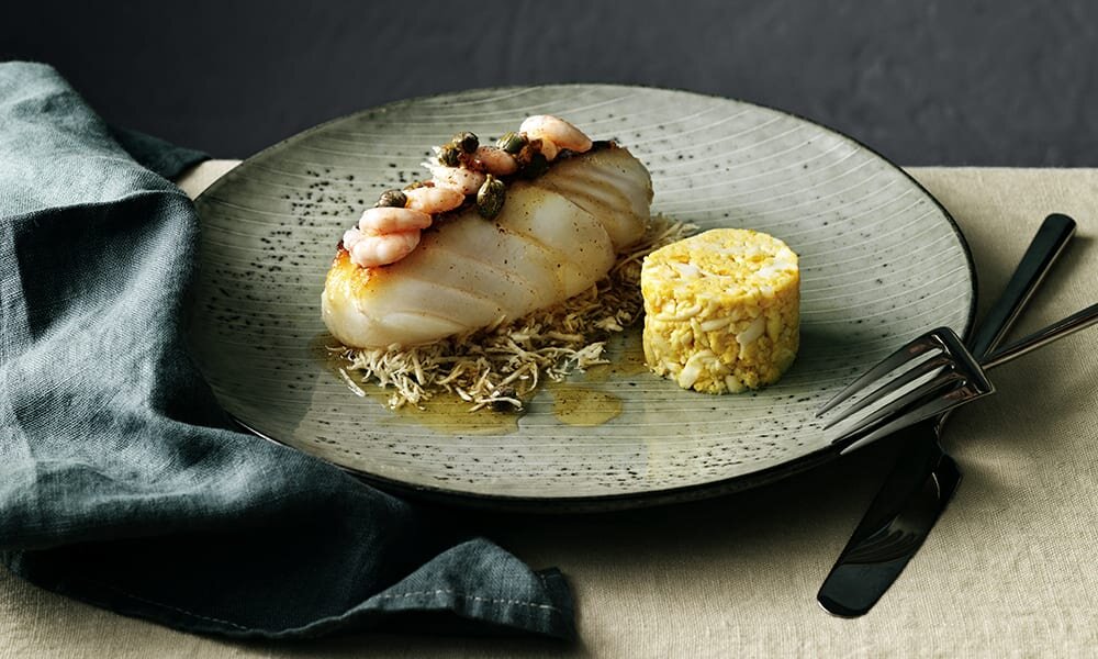 Podawaj rybę z krewetkami, ćwiartkami jajek i masłem z kaparami. Posyp startym chrzanem.