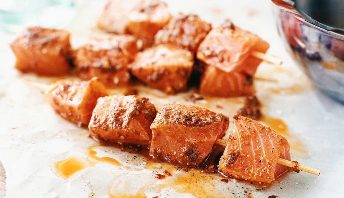 Nadziej kawałki łososia na patyczki do szaszłyków i zanurz je w marynacie przynajmniej na 20 minut.